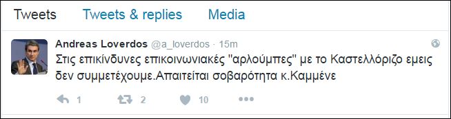 «Στις επικίνδυνες επικοινωνιακές «αρλούμπες» με το Καστελόριζο εμείς δεν συμμετέχουμε. Απαιτείται σοβαρότητα κ. Καμμένε», έγραψε χαρακτηριστικά στον προσωπικό του λογαριασμό ο Ανδρέας Λοβέρδος.