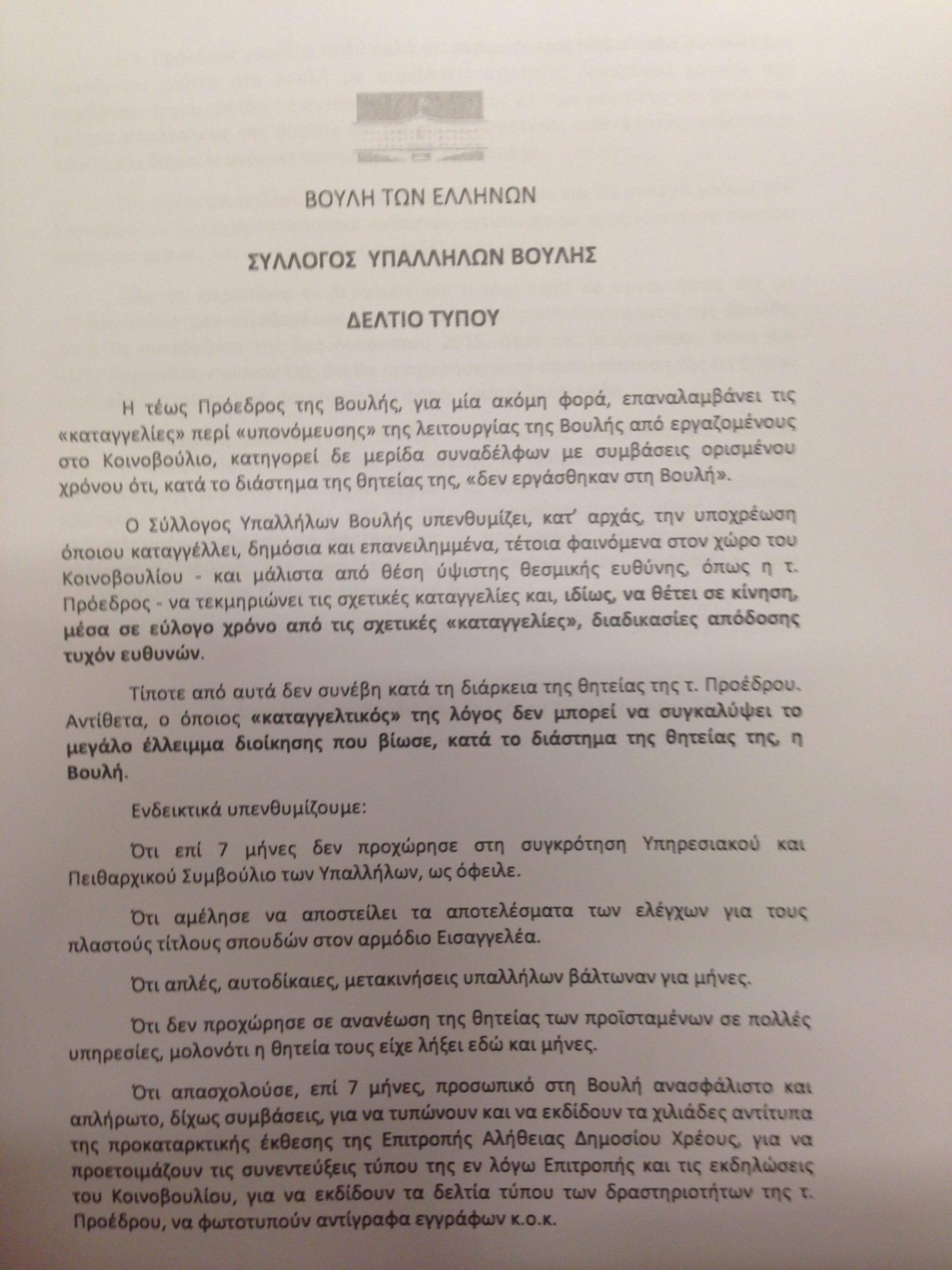 Με ανακοίνωση του σήμερα ο Σύλλογος των Υπαλλήλων της Βουλής, εξαίρει την αποφασιστική αντιμετώπιση από τον πρόεδρο Νίκο Βούτση, των προβλημάτων της «απλήρωτης και ανασφάλιστης εργασίας» σε αντιδιαστολή των πεπραγμένων της διοίκησης επί των ημερών της τέως προέδρου, Ζωής Κωνσταντοπούλου.