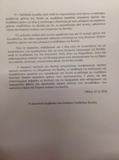 Αναφέρει επίσης, ότι η ίδια η κ. Κωνσταντοπούλου αναγνώριζε το προβληματικό καθεστώς των συμβασιούχων υπαλλήλων, όταν δεσμεύτηκε «έστω και καθυστερημένα» (στις 3 Αυγούστου) ότι θα προχωρήσει σε αποκατάσταση της αδικίας εις βάρος τους, «κάτι που δεν συνέβη».