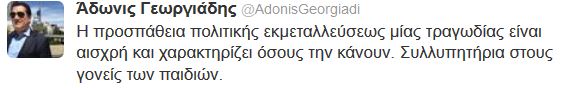 “Η προσπάθεια πολιτικής εκμεταλλεύσεως μίας τραγωδίας είναι αισχρή και χαρακτηρίζει όσους την κάνουν. Συλλυπητήρια στους γονείς των παιδιών”, ήταν το σχόλιο του βουλευτή της Νέας Δημοκρατίας για να του απαντήσει ένας χρήσης του Twitter: