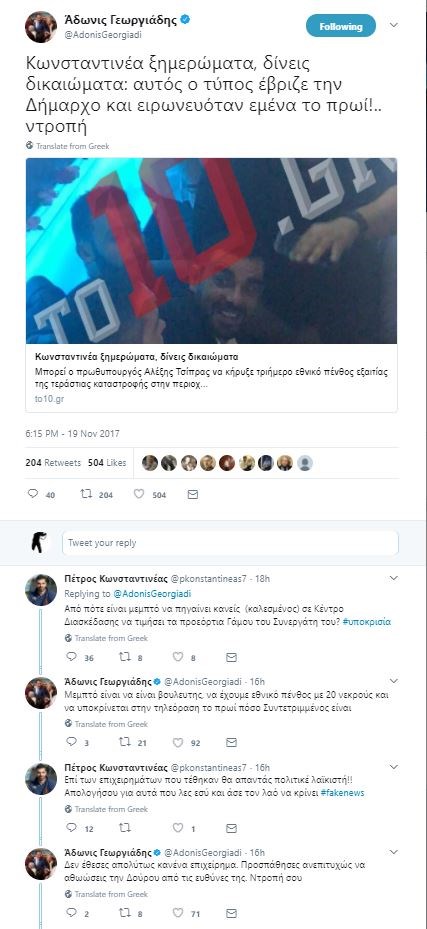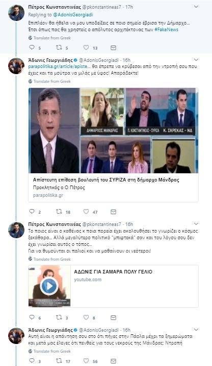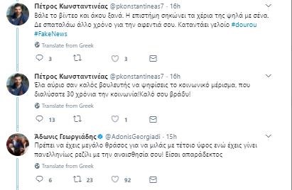 Η κόντρα συνεχίστηκε με τον κ. Κωνσταντινέα να γράφει: «Επί των επιχειρημάτων που τέθηκαν θα απαντάς πολιτικέ λαϊκιστή!! Απολογήσου για αυτά που λες εσύ και άσε τον λαό να κρίνει #fakenews» και τον κ. Γεωργιάδη να απαντά εκ νέου.