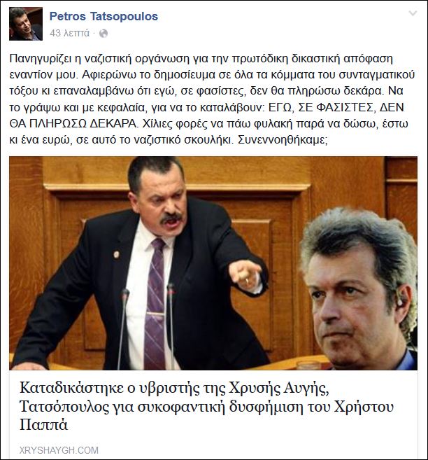Την έντονη αντίδραση του Πέτρου Τατσόπουλου προκάλεσε η πρωτόδικη δικαστική απόφαση, σύμφωνα με την οποία του επιβλήθηκε πρόστιμο 3.000 ευρώ για εξύβριση και συκοφαντική δυσφήμιση του βουλευτή της Χρυσής Αυγής, Χρήστου Παππά. Ο πρώην βουλευτής ανέβασε στην προσωπική του σελίδα στο Facebook την σχετική ανάρτηση από την ιστοσελίδα της Χρυσής Αυγής με το ακόλουθο σχόλιο: