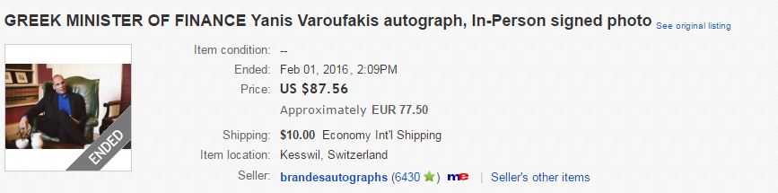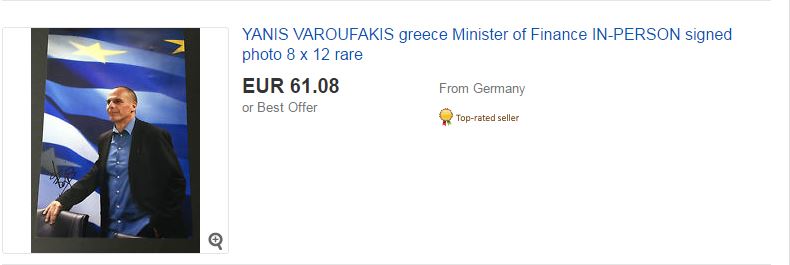 Η δεύτερη φωτογραφία που είναι επίσης υπογεγραμμένη από τον κ. Βαρουφάκη, όπως ισχυρίζεται ο πωλητής της, πωλείται για 61 ευρώ.