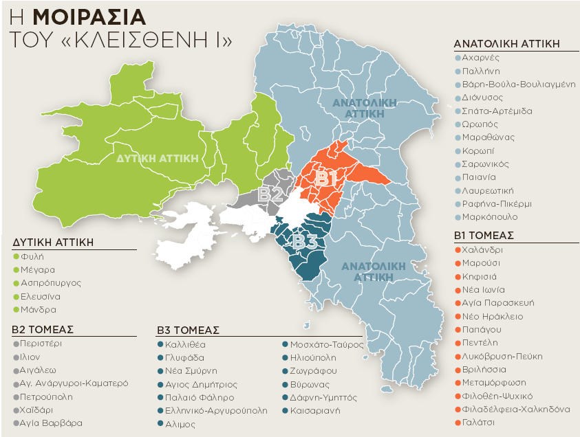 Σύμφωνα με την τροπολογία, η μεγαλύτερη περιφέρεια της χώρας με τις 44 έδρες χωρίζεται στο Βόρειο Τομέα (Β1) που περιλαμβάνει 14 δήμους και θα έχει 15 έδρες, στο Δυτικό Τομέα (Β2) με 7 δήμους και θα έχει 11 έδρες και στο Νότιο Τομέα (Β3) με 13 δήμους που θα έχει 18 έδρες.