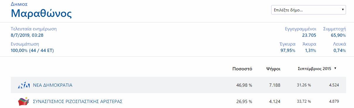 Στον Δήμο Μαραθώνα η Νέα Δημοκρατία αύξησε το ποσοστό της κατά 16 μονάδες σε σχέση με τον Σεπτέμβριο του 2015 κατακτώντας ποσοστό 46,98%.
