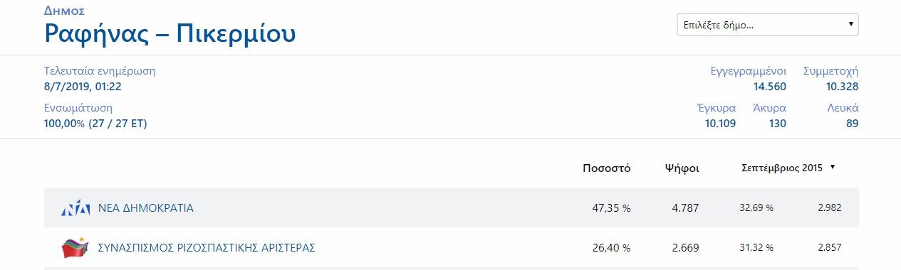 Αντίστοιχα είναι όμως και τα ποσοστά στο Δήμο Ραφήνας- Πικερμίου όπου η ΝΔ κατάφερε να συγκεντρώσει 47,35% έναντι 32,69% που είχε τον Σεπτέμβριο του 2015, ενώ ο ΣΥΡΙΖΑ ήρθε δεύτερος με ποσοστό 26,4% έναντι του 31,32% που είχε καταφέρει να αποσπάσει το 2015.