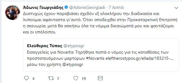«Δυστυχώς έχουν παραβιάσει σχεδόν εξ ολόκληρου τη διαδικασία και λυπούμαι αφάνταστα γι’ αυτό», έγραψε μεταξύ άλλων στον λογαριασμό του στο Twitter o αντιπρόεδρος της ΝΔ, Άδωνις Γεωργιάδης σχολιάζοντας τη δήλωση της Εισαγγελέως Διαφθοράς, Ελένης Τουλουπάκη για την υπόθεση της Novartis.