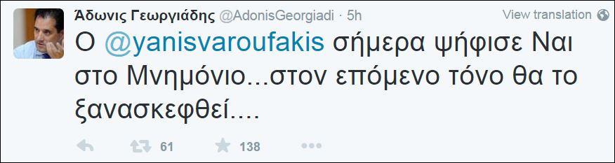 Μέσω του λογαριασμού του στο twitter σχολίασε ο κοινοβουλευτικός εκπρόσωπος της ΝΔ, Άδωνις Γεωργιάδης, την αλλαγή στάσης του Γιάνη Βαρουφάκη στη χθεσινή ψηφοφορία και την επιλογή του να υπερψηφίσει το νομοσχέδιο.