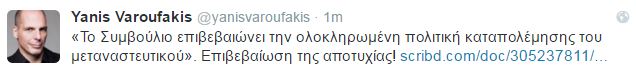«”Το Συμβούλιο επιβεβαιώνει την ολοκληρωμένη πολιτική καταπολέμησης του μεταναστευτικού”. Επιβεβαίωση της αποτυχίας!» έγραψε ο κ. Βαρουφάκης.