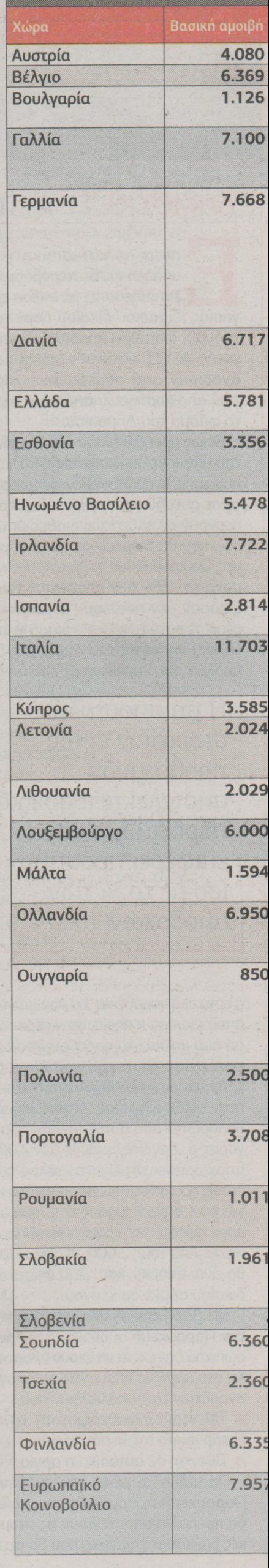 Επί του πρακτέου, στο ρετιρέ των αμοιβών “κατοικούν” οι Ιταλοί βουλευτές με 11.703 ευρώ μηνιαίως, ενώ στα χαμηλά βρίσκονται οι Ούγγροι συνάδελφοί τους με 850 ευρώ μηνιαίως.