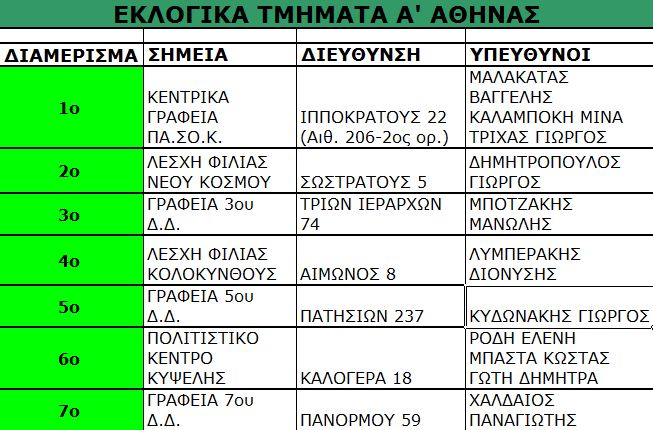 Τα εκλογικά τμήματα της Α’ Αθήνας είναι τα εξής: