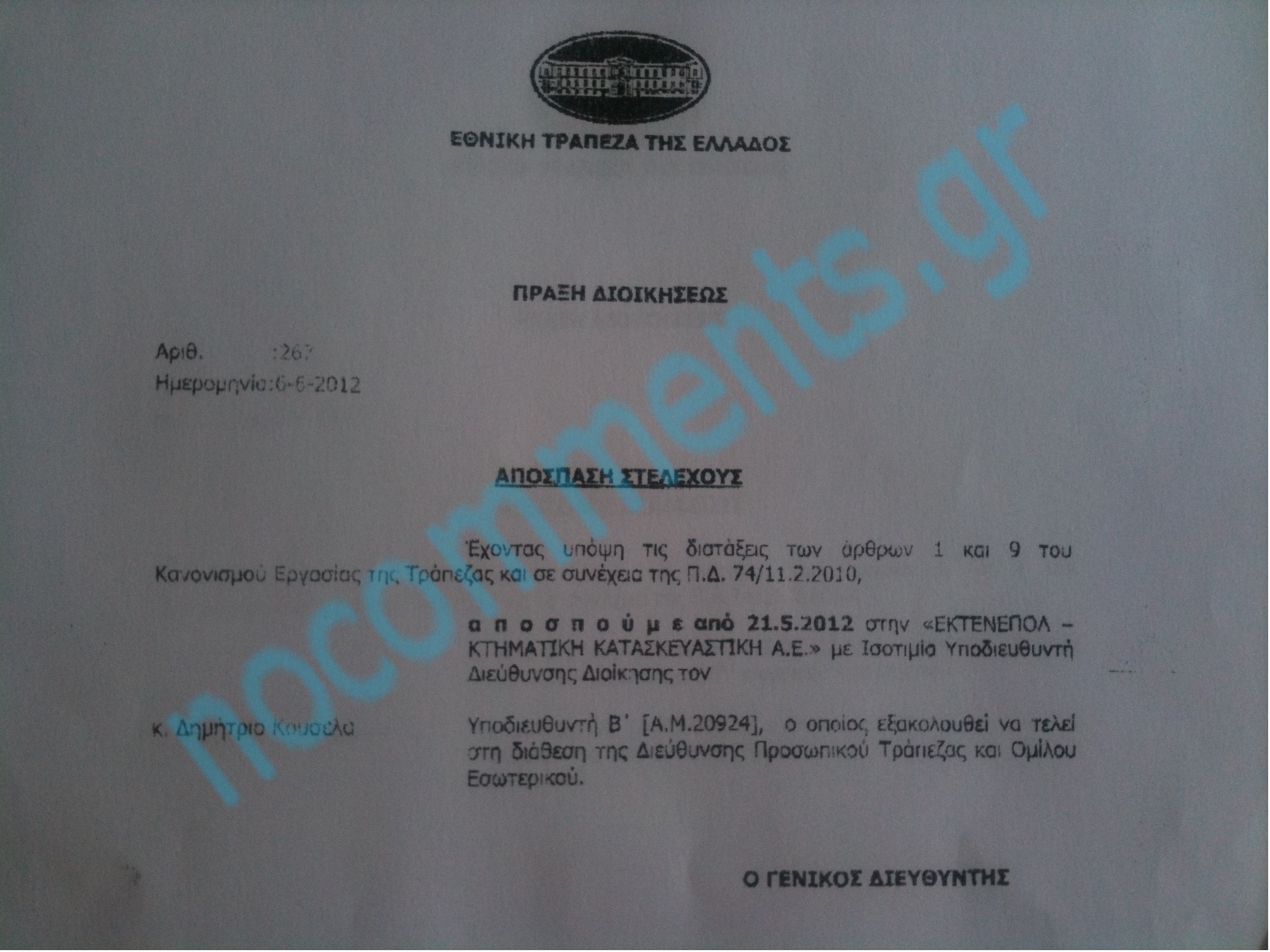 Με διοικητική πράξη της Εθνικής τράπεζας ο πρώην υφυπουργός Οικονομικών Δημήτρης Κουσελάς και ο πρώην Υπουργός του ΠΑΣΟΚ Χρήστος Πρωτόπαππας αποσπώνται σε κατασκευαστικές εταιρίες.Όπως αποκαλύπτει το nocomments.gr, η απόσπαση των δυο πρώην υπουργών έγινε ταυτόχρονα, στις 21 Μαίου, 15 ημέρες μετά τις εκλογές της 6ης Μαίου, στις οποίες έχασαν την βουλευτική τους έδρα.Στο έγγραφο της Εθνικής τράπεζας , με αριθμό 267, που υπογράφει ο Γενικός Διευθυντής Ανδρέας Βρανάς , ο πρώην υφυπουργός Οικονομικών Δημήτρης Κουσελάς αποσπάται από 21.5.2012, στην «ΕΚΤΕΝΕΠΟΛ-ΚΤΗΜΑΤΙΚΗ ΚΑΤΑΣΚΕΥΑΣΤΙΚΗ Α.Ε» με Ισοτιμία Υποδιευθυντή Διεύθυνσης Διοίκησης και ο οποίος όπως αναγράφεται στο έγγραφο, εξακολουθεί να τελεί στη διάθεση της Διεύθυνσης Προσωπικού Τράπεζας και Ομίλου Εσωτερικού.