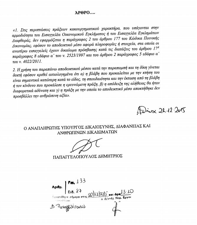 Τροπολογία με την οποία επιτρέπεται η χρήση αποδεικτικών μέσων που έχουν αποκτηθεί με αξιόποινες πράξεις ή μέσω αυτών, κατέθεσε ο αναπληρωτής υπουργός Δικαιοσύνης αρμόδιος για θέματα διαφθοράς Δημήτρης Παπαγγελόπουλος στο στο νομοσχέδιο για το σύμφωνο συμβίωσης.