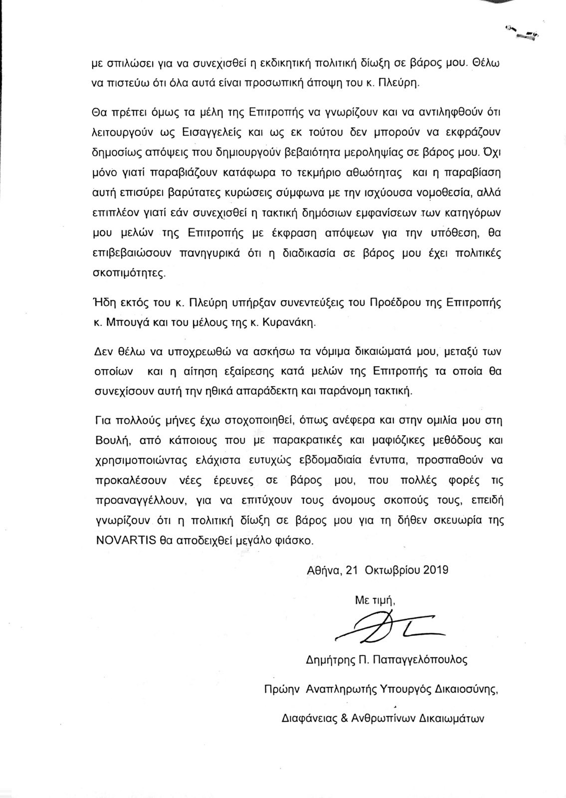 Αίσθηση προκαλεί η κατάληξη του υπομνήματος του κ. Παπαγγελόπουλου ο οποίος επισημαίνει ότι τρία μέλη της Επιτροπής οι κ.κ Πλεύρης, Μπούγας και Κυρανάκης έχουν αναφερθεί σε συνεντεύξεις τους στην υπόθεση με τον τέως υπουργό να τονίζει ότι δεν θέλει να ασκήσει το νόμιμο δικαίωμά του να ζητήσει εξαίρεση τους.