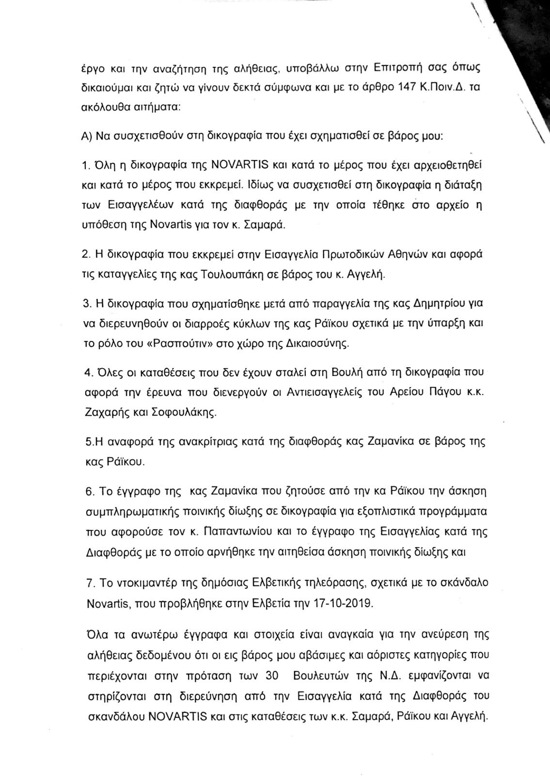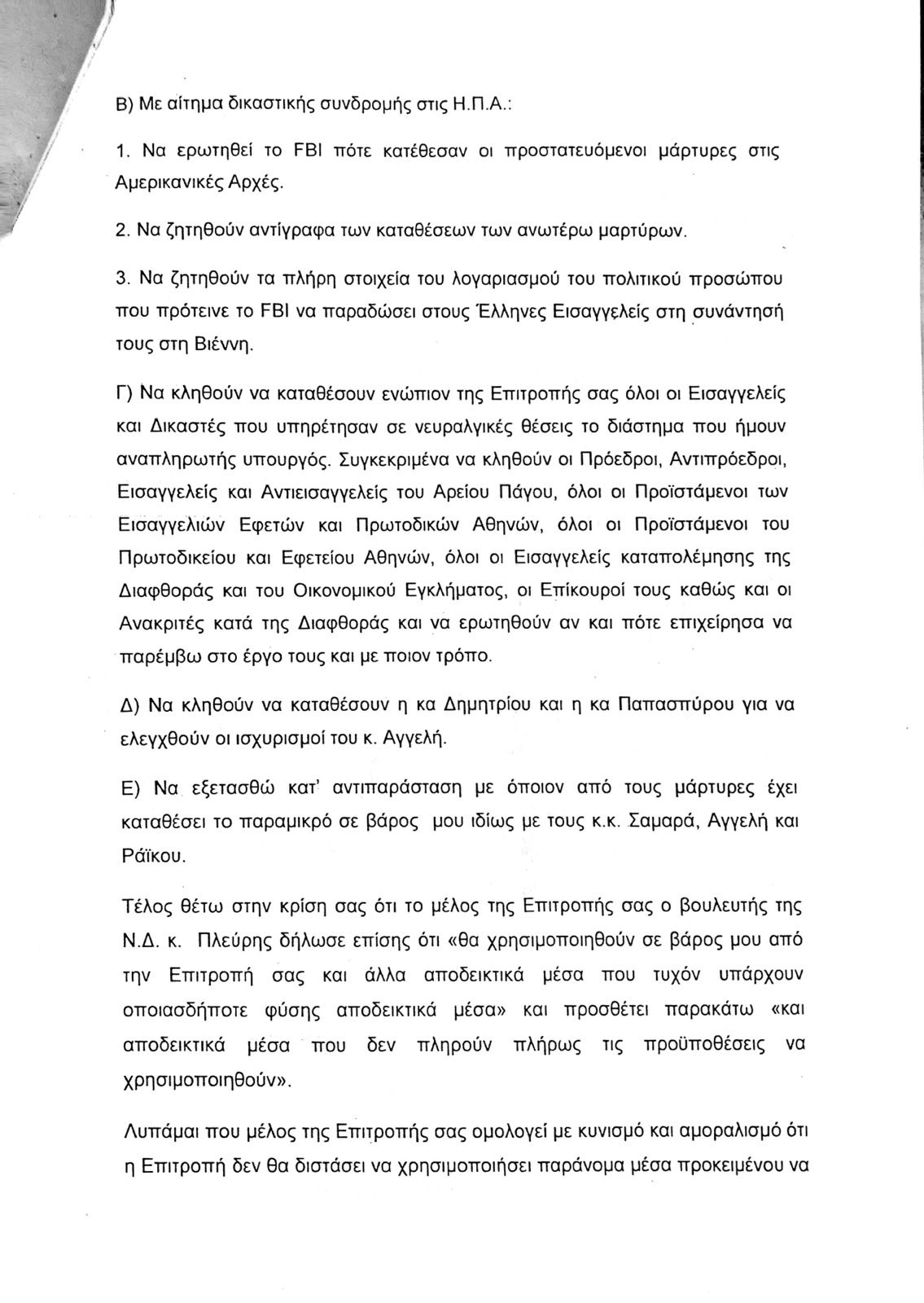 Μεταξύ άλλων ο κ. Παπαγγελόπουλος ζητεί να συσχετισθούν όλες οι δικογραφίες, να καταθέσουν στην Επιτροπή όλοι οι δικαστικοί και εισαγγελικοί λειτουργοί που διετέλεσαν σε πόστα ευθύνης κατά την υπουργία του ενώ επαναλαμβάνει το αίτημά του για κατ’ αντιπαράσταση εξέταση με όσους αναφέρθηκαν σε αυτόν, ιδίως με τον κ. Αντώνη Σαμαρά και τους εισαγγελείς κ.κ. Ράϊκου και Αγγελή.