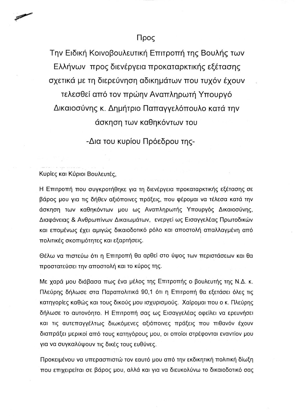 Τι αναφέρει το υπόμνημα του κ. Παπαγγελόπουλου: