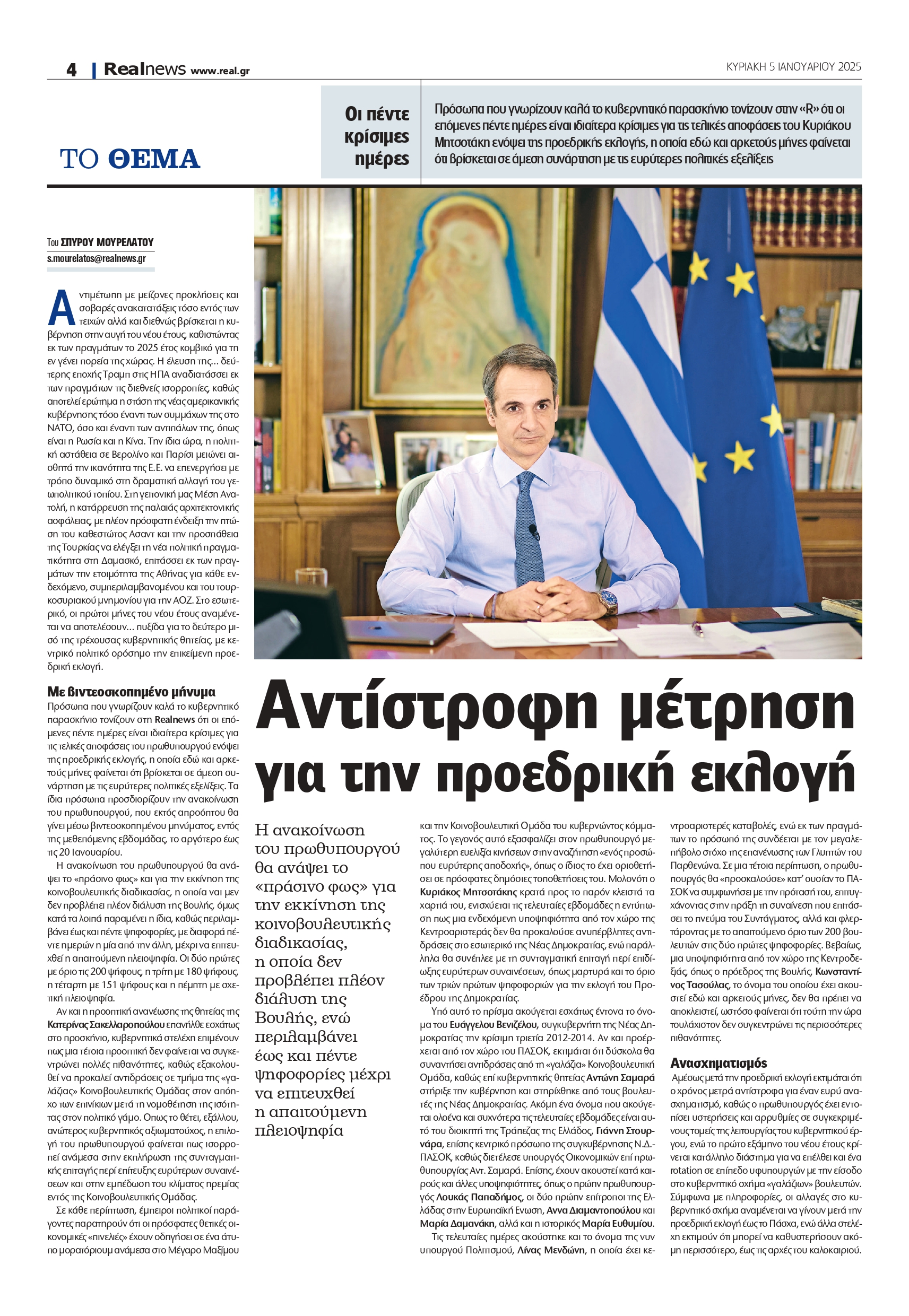 Πρόσωπα που γνωρίζουν καλά το κυβερνητικό παρασκήνιο τονίζουν στη Realnews ότι οι επόμενες πέντε ημέρες είναι ιδιαίτερα κρίσιμες για τις τελικές αποφάσεις του πρωθυπουργού ενόψει της προεδρικής εκλογής, η οποία εδώ και αρκετούς μήνες φαίνεται ότι βρίσκεται σε άμεση συνάρτηση με τις ευρύτερες πολιτικές εξελίξεις. Τα ίδια πρόσωπα προσδιορίζουν την ανακοίνωση του πρωθυπουργού, που εκτός απροόπτου θα γίνει μέσω βιντεοσκοπημένου μηνύματος, εντός της μεθεπόμενης εβδομάδας, το αργότερο έως τις 20 Ιανουαρίου.