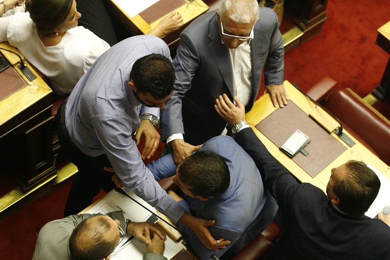 Σε ρόλο… πυροσβέστη ο βουλευτής Μεσσηνίας και πρώην διαιτητής, Πέτρος Κωνσταντινέας που έσπευσε να χωρίσει τους συναδέλφους του.