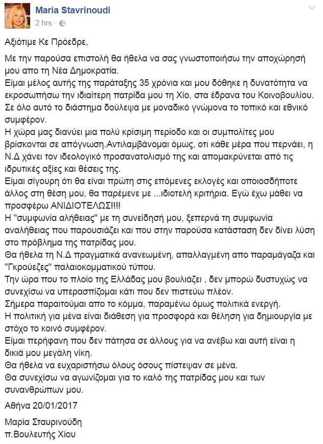 Με την παρούσα επιστολή θα ήθελα να σας γνωστοποιήσω την αποχώρησή μου από τη Νέα Δημοκρατία.
