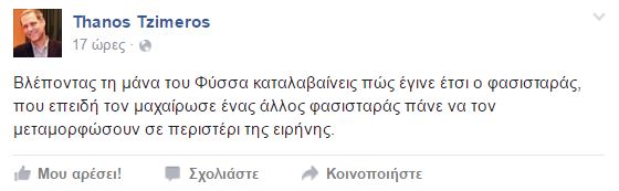 Προκλητικός εμφανίστηκε για ακόμη μία φορά ο Θάνος Τζήμερος, ο οποίος, σε ανάρτησή του στο Facebook χρησιμοποιεί βαρύτατους χαρακτηρισμούς κατά του Παύλου Φύσσα.