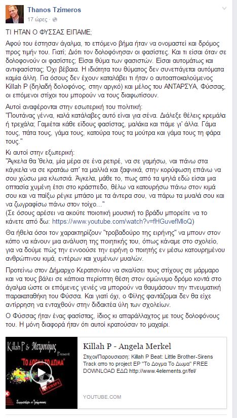 “Βλέποντας τη μάνα του Φύσσα καταλαβαίνεις πώς έγινε έτσι ο φασισταράς, που επειδή τον μαχαίρωσε ένας άλλος φασισταράς πάνε να τον μεταμορφώσουν σε περιστέρι της ειρήνης” έγραψε αρχικά και στη συνέχεια έκανε μια δεύτερη εκτενέστατη ανάρτηση.