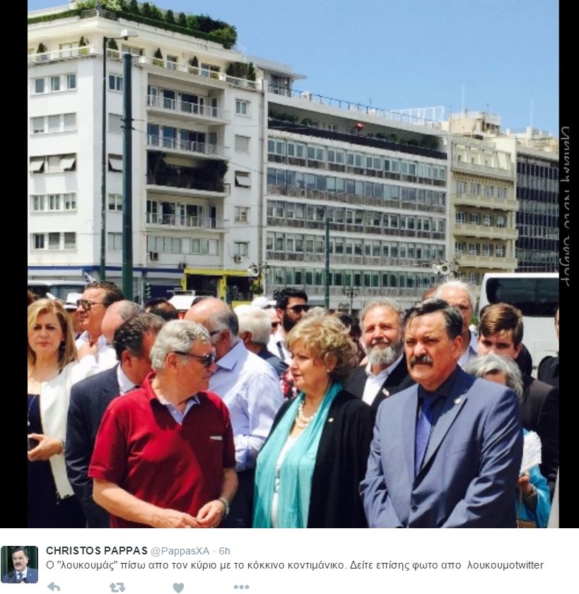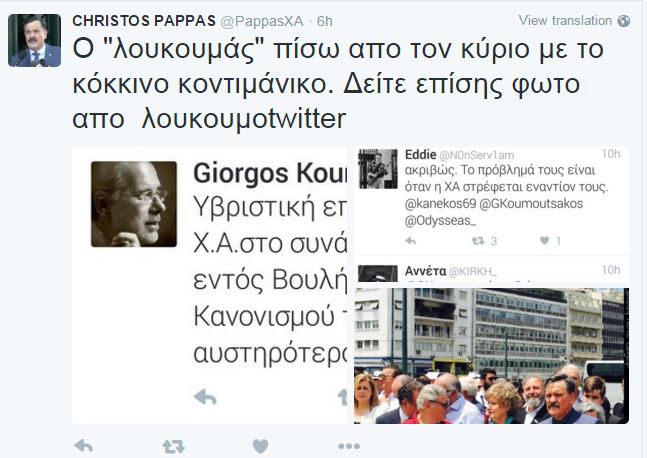 “Ο “λουκουμάς” πίσω απο τον κύριο με το κόκκινο κοντιμάνικο. Δείτε επίσης φωτο απο λουκουμοtwitter” γράφει και επισυνάπτει φωτογραφία με το tweet του βουλευτή της ΝΔ για το επεισόδιο με τον κ. Κωνσταντινόπουλο στη βουλή καθώς και μια φωτογραφία στην οποία διακρίνεται ο κ. Κουμουτσάκος.