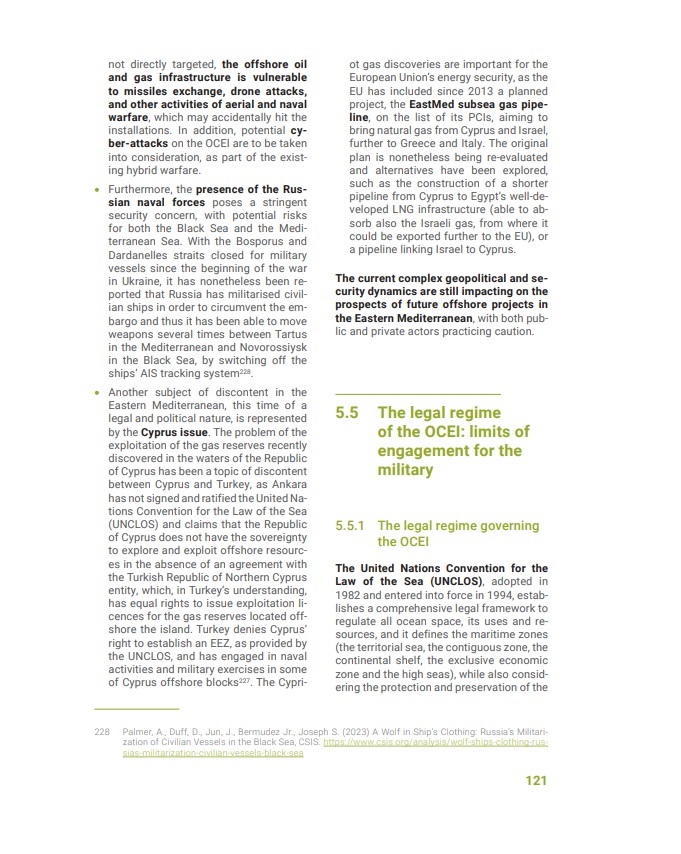 Συγκεκριμένα στην σελίδα 121 αναφέρει για τα Κατεχόμενα ότι «η Άγκυρα δεν έχει υπογράψει και επικυρώσει τη Σύμβαση των Ηνωμένων Εθνών για το Δίκαιο της Θάλασσας (UNCLOS) και ισχυρίζεται ότι η Κυπριακή Δημοκρατία δεν έχει την κυριαρχία για εξερεύνηση και εκμετάλλευση υπεράκτιων πόρων ελλείψει συμφωνίας με την οντότητα της Τουρκικής Δημοκρατίας της Βόρειας Κύπρου, η οποία, κατά την αντίληψη της Τουρκίας, έχει ίσα δικαιώματα να εκδίδει άδειες εκμετάλλευσης για τα αποθέματα φυσικού αερίου που βρίσκονται στα ανοιχτά του νησιού».