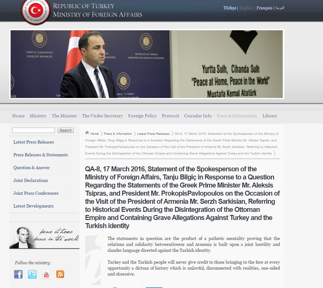 Το δελτίο Τύπου του υπουργείου Εξωτερικών της Τουρκίας αναφέρει χαρακτηριστικά: «Δήλωση του Εκπροσώπου του Υπουργείου Εξωτερικών Tanju Bilgic σε μία ερώτηση σχετικά με τις δηλώσεις του Έλληνα Πρωθυπουργού Αλέξη Τσίπρα και του Προέδρου, Προκόπη Παυλόπουλου με την ευκαιρία της επίσκεψης του Προέδρου της Αρμενίας Σερζ Σαρκισιάν.