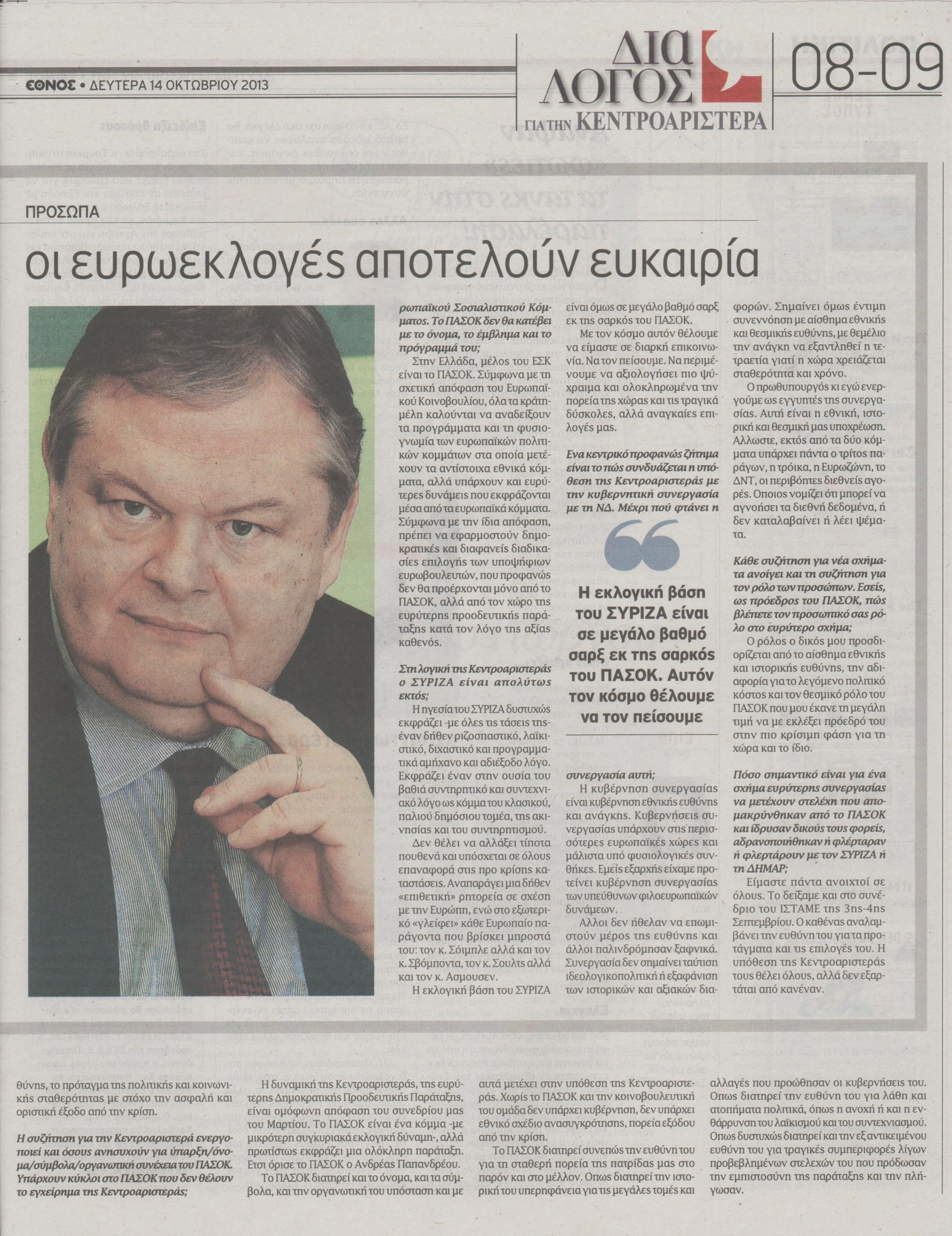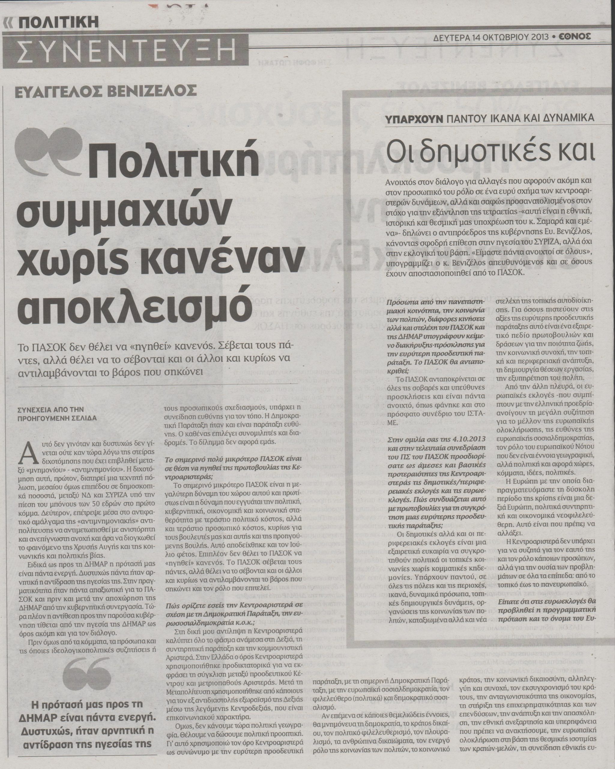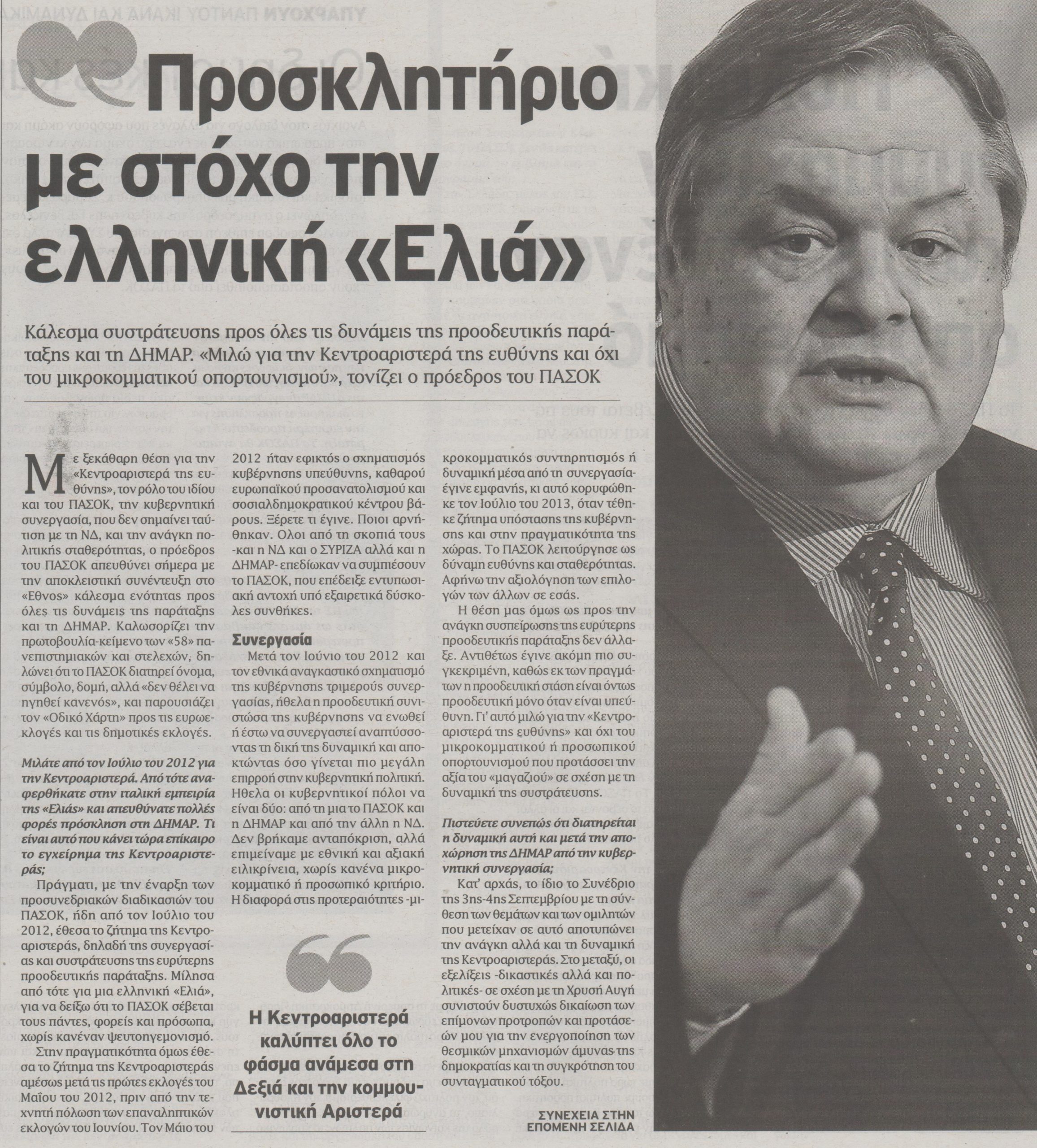 Ο κ. Βενιζέλος δηλώνει ανοιχτός στον διάλογο για αλλαγές που αφορούν ακόμη και στον προσωπικό του ρόλο, σε ένα ευρύ σχήμα των κεντροαριστερών δυνάμεων. «Από τον Ιούλιο του 2012 έθεσα το ζήτημα της Κεντροαριστεράς. Μίλησα από τότε για μια ελληνική “Ελιά”, για να δείξω ότι το ΠΑΣΟΚ σέβεται τους πάντες, φορείς και πρόσωπα, χωρίς κανέναν ψευτοηγεμονισμό» τονίζει.