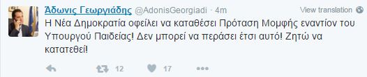 Να καταθέσει η Νέα Δημοκρατία, πρόταση μομφής εναντίον του υπουργού Παιδείας ζητάει ο υποψήφιος για την ηγεσία του κόμματος, Άδωνις Γεωργιάδης, μέσω του λογαριασμού του στο twitter. “Δεν μπορεί να περάσει έτσι αυτό” πρόσθεσε.