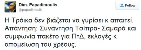 «Η Τρόικα δεν βιάζεται να γυρίσει και απαιτεί. Απάντηση: Συνάντηση Τσίπρα-Σαμαρά και συμφωνία πακέτο για ΠτΔ, εκλογές και απομείωση του χρέους», γράφει στον προσωπικό του λογαριασμό στο Twitter.΄