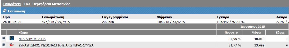 Την πρώτη θέση στην προτίμηση των ψηφοφόρων απέσπασε η Νέα Δημοκρατία στο νομό Μεσσηνίας με τον ΣΥΡΙΖΑ, ωστόσο, να κερδίζει τις περισσότερες έδρες. Η Νέα Δημοκρατία συγκέντρωσε το 37,95% κερδίζοντας μια έδρα την ώρα που ο ΣΥΡΙΖΑ κερδίζει τέσσερις έδρες με ποσοστό 31,77% εξαιτίας της ποσόστωσης από το μπόνους των 50 εδρών, σύμφωνα με το εκλογικό σύστημα.