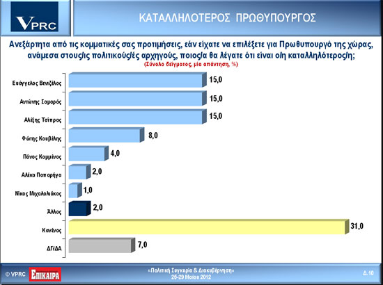 Για ακόμη μία φορά, καταλληλότερος πρωθυπουργός αναδεικνύεται ο… “κανένας” με 31%. Ακολουθεί, τριπλή ισοπαλία. Αντώνης Σαµαράς, Αλέξης Τσίπρας και Ευάγγελος Βενιζέλος θεωρούνται καταλληλότεροι για πρωθυπουργοί από το 15% των ερωτηθέντων και βρίσκονται και οι τρεις στη δεύτερη θέση! Τον Φώτη Κουβέλη θεωρεί καταλληλότερο για την πρωθυπουργία ποσοστό 8%, ενώ ο Πάνος Καµµένος συγκεντρώνει 4%.