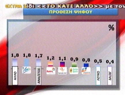 Σύμφωνα με την δημοσκόπηση του Οικονομικού Πανεπιστημίου Αθηνών, στην πρόθεση ψήφου προηγείται η Νέα Δημοκρατία με 27%, ακολουθεί ο ΣΥΡΙΖΑ με 26,4%, τρίτο κόμμα είναι το ΠΑΣΟΚ με 15,3% και στη συνέχεια οι ΑΝΕΞΑΡΤΗΤΟΙ ΕΛΛΗΝΕΣ με 8,7%, η ΔΗΜΑΡ με 4,8%, η Χρυσή Αυγή με 4,1% και το ΚΚΕ με 3,4% .