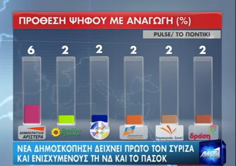 Πρωτιά στον ΣΥΡΙΖΑ δίνει και νέα δημοσκόπηση της εταιρείας PULSE που δημοσιεύεται στην εφημερίδα «Το Ποντίκι». Στην πρόθεση ψήφου ο ΣΥΡΙΖΑ συγκεντρώνει 24,5%, ενώ δεύτερη είναι η ΝΔ με 21,5% και τρίτο το ΠΑΣΟΚ με 15%. Ακολουθούν οι Ανεξάρτητοι Έλληνες με 8%, η Χρυσή Αυγή, το ΚΚΕ και η ΔΗΜΑΡ με 6% . Εκτός βουλής, σύμφωνα με την δημοσκόπηση παραμένουν ΛΑ.Ο.Σ., Δημοκρατική Συμμαχία και Οικολόγοι Πράσινοι.