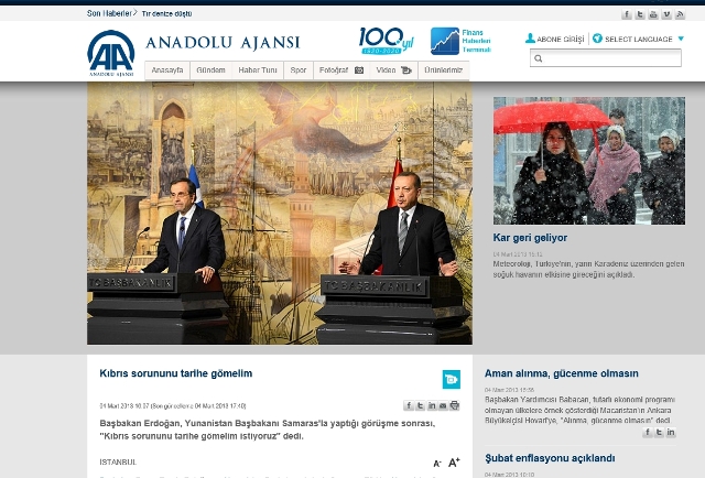 Πιο συγκεκριμένα το τουρκικό πρακτορείο ειδήσεων Anadolu αναφέρεται με το ρεπορτάζ του στη δήλωση του Ταγίπ Ερντογάν ότι η χώρα του είναι πρόθυμη να εργαστεί από κοινού με τον Αντώνη Σαμαρά για την επίλυση του κυπριακού. «Ο Τούρκος πρωθυπουργός καλεί σε κοινή προσπάθεια με την Ελλάδα προκειμένου να λυθεί το κυπριακό θέμα» σημειώνει το τουρκικό πρακτορείο ειδήσεων.