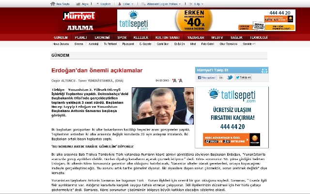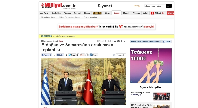 Εκτενές ρεπορτάζ για τις δηλώσεις των κ.κ. Ταγίπ Ερντογάν και Αντώνη Σαμαρά δημοσιεύει και η εφημερίδα Milliyet, που σημειώνει τις τοποθετήσεις για το θέμα του κυπριακού.