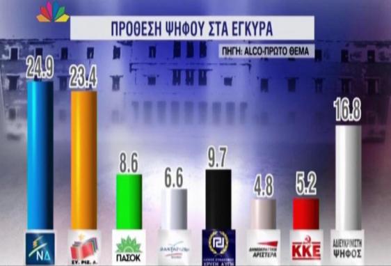 Μιάμιση μονάδα προβάδισμα στη ΝΔ δίνει η δημοσκόπηση της Αlco, που δημοσιεύει το «Πρώτο Θέμα», καθώς συγκεντρώνει το 24,9% έναντι 23,4 του ΣΥΡΙΖΑ. Η Χρυσή Αυγή συγκεντρώνει 9,7%, το ΠΑΣΟΚ 8,6%, οι Ανεξάρτητοι Έλληνες 6,6%, το ΚΚΕ 5,2% και η ΔΗΜΑΡ 4,8%.