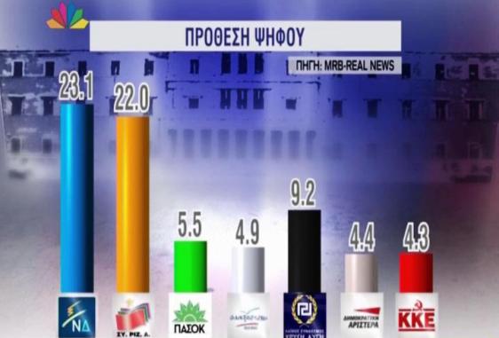 Σε δημοσκόπηση της ΜRΒ, που δημοσιεύει σήμερα η Real news, η ΝΔ προηγείται με ποσοστό 1,1% του ΣΥΡΙΖΑ. Συγκεκριμένα, η ΝΔ συγκεντρώνει ποσοστό 23,1%, ο ΣΥΡΙΖΑ 22%, η Χρυσή Αυγή 9,2%, το ΠΑΣΟΚ 5,5%, οι Ανεξάρτητοι Έλληνες 4,9%, η ΔΗΜΑΡ 4,4% και το ΚΚΕ 4,3%.