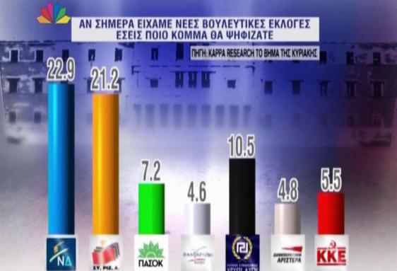 Προβάδισμα 1,7% στη ΝΔ έναντι του ΣΥΡΙΖΑ δίνει δημοσκόπηση της Κάπα Research για το Βήμα της Κυριακής. Συγκεκριμένα, το 22,9% των ερωτηθέντων δηλώνει ότι θα ψήφιζε ΝΔ εάν είχαμε σήμερα νέες βουλευτικές εκλογές, το 21,2% ΣΥΡΙΖΑ, το 10,5% Χρυσή Αυγή, το 7,2% ΠΑΣΟΚ, το 5.5% ΚΚΕ, το 4,8% ΔΗΜΑΡ και το 4,6% Ανεξάρτητους Έλληνες.