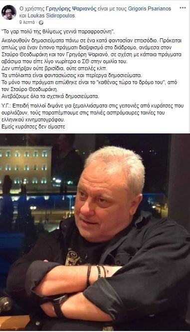 Για «κατά φαντασίαν επεισόδιο» με τον Σταύρο Θεοδωράκη κάνει λόγο σε ανάρτησή στο προφίλ του στο Facebook ο ανεξάρτητος βουλευτής, Γρηγόρης Ψαριανός.«Το γαρ πολύ της θλίψεως γεννά παραφροσύνη. Ακολουθούν δημοσιεύματα πάνω σε ένα κατά φαντασίαν επεισόδιο», αναφέρει μεταξύ άλλων στην ανάρτησή του ο κ. Ψαριανός και συμπληρώνει: «Πρόκειται απλώς για έναν έντονο πράγματι διαξιφισμό στο διάδρομο, ανάμεσα στον Σταύρο Θεοδωράκη και τον Γρηγόρη Ψαριανό, σε σχέση με κάποια πράγματα αβάσιμα που είπε λίγο νωρίτερα ο Σταύρος Θεοδωράκης στην ομιλία του. Δεν υπήρξαν ούτε βρισίδια, ούτε απειλές κλπ.Τα υπόλοιπα είναι φαντασιώσεις και περίεργα δημοσιεύματα».«Επειδή πολλοί διψάνε για ξεμαλλιάσματα στις γειτονιές από κυράτσες που ουρλιάζουν, τούς παραπέμπουμε στις παλιές ασπρόμαυρες ταινίες του ελληνικού κινηματογράφου. Εμείς κυράτσες δεν είμαστε», υποστήριξε ακόμη ο κ. Ψαριανός.Δείτε την ανάρτηση:
