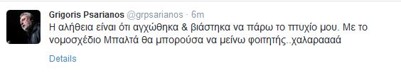 Τις πρώτες του «δηλώσεις» ως πτυχιούχος του Πανεπιστημίου Πειραιώς, έκανε ο βουλευτής του Ποταμιού, Γρηγόρης Ψαριανός, με ανάρτηση του στο Twitter, έχοντας μάλιστα χιουμοριστική διάθεση. Συγκεκριμένα, ο κ. Ψαριανός έγραψε: «Η αλήθεια είναι ότι αγχώθηκα και βιάστηκα να πάρω το πτυχίο μου. Με το νομοσχέδιο Μπαλτά θα μπορούσα να μείνω φοιτητής. Χαλαρά.
