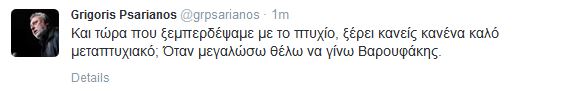 Λίγη ώρα με νεότερη ανάρτηση του , ο κ. Ψαριανός, πρόσθεσε: «Και τώρα που ξεμπερδέψαμε με το πτυχίο, ξέρει κανείς κανένα καλό μεταπτυχιακό; Όταν μεγαλώσω θέλω να γίνω Βαρουφάκης».