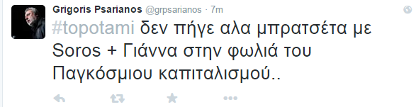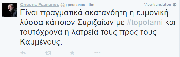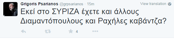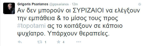 Επίθεση προς βουλευτές του ΣΥΡΙΖΑ, εξαπολύει μέσω του λογαριασμού του στο twitter, o βουλευτής του Ποταμιού, Γρηγόρης Ψαριανός κατηγορώντας τους “για εμπάθεια και μίσος προς το Ποτάμι”: