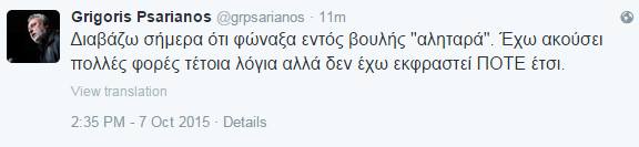 Παράλληλα ο κ. Ψαριανός διαψεύδει δημοσιεύματα που ανέφεραν οτι κατά τη διάρκεια της χθεσινής συνεδρίασης της Βουλής, χρησιμοποίησε τη λέξη “αληταράς”.