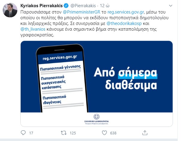 “Παρουσιάσαμε στον @PrimeministerGR το http://reg.services.gov.gr, μέσω του οποίου οι πολίτες θα μπορούν να εκδίδουν πιστοποιητικά δημοτολογίου και ληξιαρχικές πράξεις. Σε συνεργασία με @theodorikakosp και @th_livanios κάνουμε ένα σημαντικό βήμα στην καταπολέμηση της γραφειοκρατίας” έγραψε ο Κυριάκος Πιερρακάκης, στον λογαριασμό του στο Twitter.