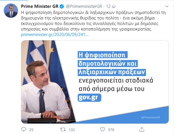 “Η ψηφιοποίηση δημοτολογικών & ληξιαρχικών πράξεων σηματοδοτεί τη δημιουργία της ηλεκτρονικής θυρίδας του πολίτη – ένα ακόμη βήμα εκσυγχρονισμού που δευκολύνει τις συναλλαγές πολιτών με δημόσιες υπηρεσίες και συμβάλλει στην καταπολέμηση της γραφειοκρατίας” έγραψε ο Πρωθυπουργός, Κυριάκος Μητσοτάκης.