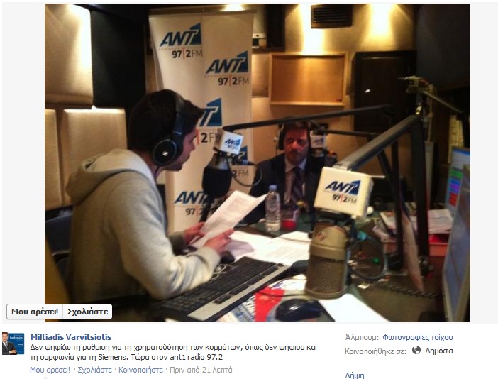 Την ώρα της ψηφοφορίας της τροπολογίας για την χρηματοδότηση των κομμάτων, ο Μιλτιάδης Βαρβιτσιώτης ήταν σε ραδιοφωνική εκπομπή στην οποία δήλωσε: «Δεν ψηφίζω τη ρύθμιση για τη χρηματοδότηση των κομμάτων, όπως δεν ψήφισα και τη συμφωνία για τη Siemens».