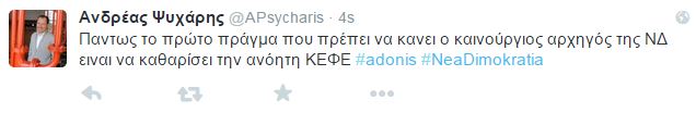 «Πάντως το πρώτο πράγμα που πρέπει να κάνει ο καινούργιος αρχηγός της ΝΔ είναι να καθαρίσει την ανόητη ΚΕΦΕ #adonis #NeaDimokratia», έγραψε χαρακτηριστικά στον προσωπικό του λογαριασμό στο twitter o Ανδρέας Ψυχάρης.