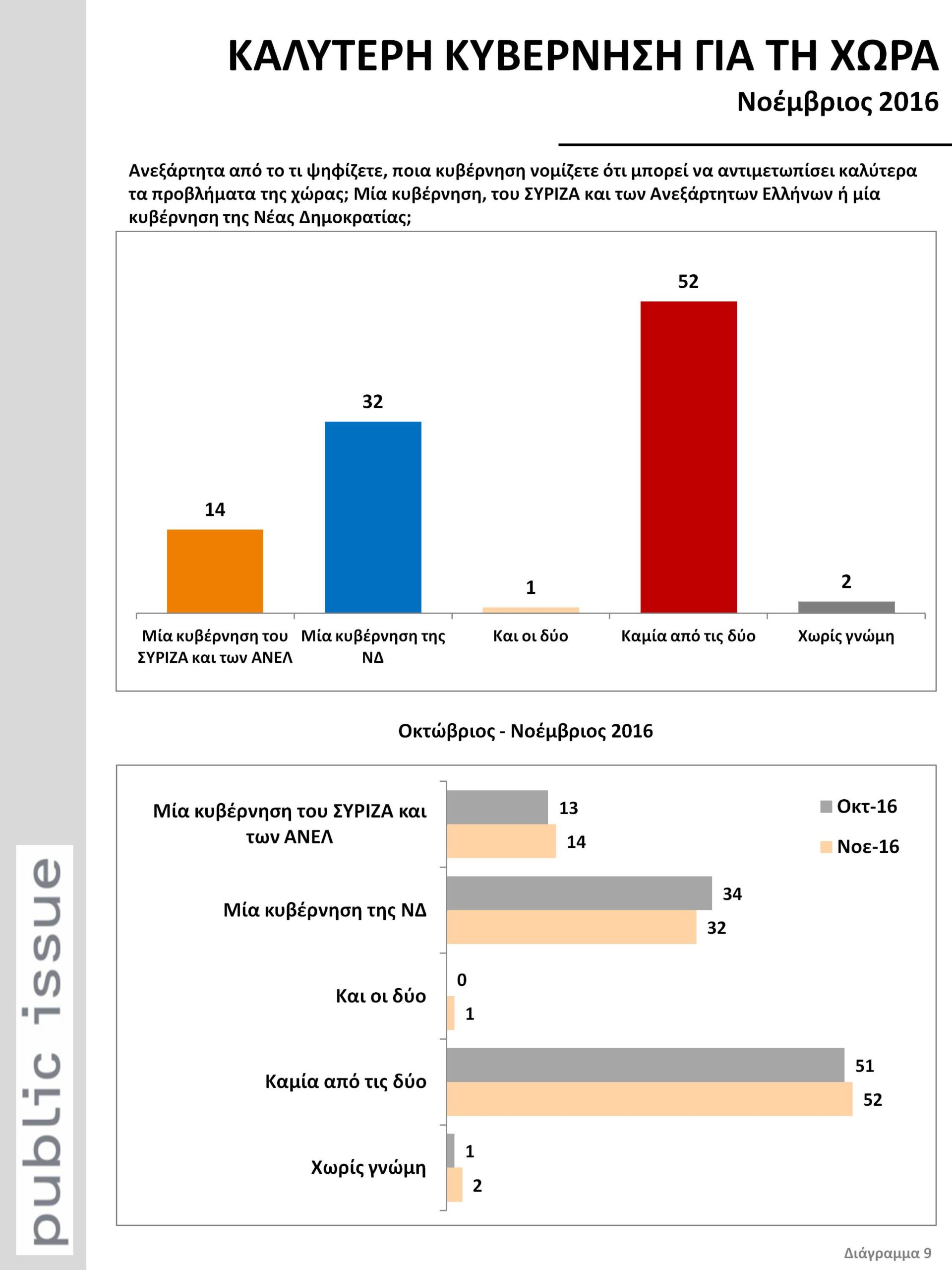 Στο ερώτημα ποια κυβέρνηση είναι καλύτερη για τη χώρα, υπέρ μίας κυβέρνησης ΝΔ τάσσεται το 32% των ερωτηθέντων, ενώ υπέρ μίας κυβέρνησης ΣΥΡΙΖΑ-ΑΝΕΛ το 14% με το «καμία από τις δυο» να συγκεντρώνει το 52% των απαντήσεων.